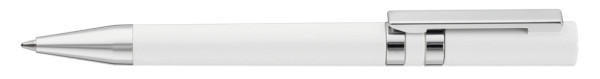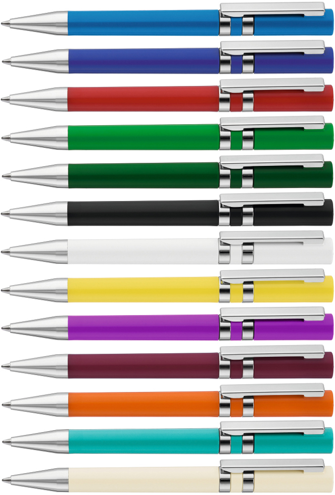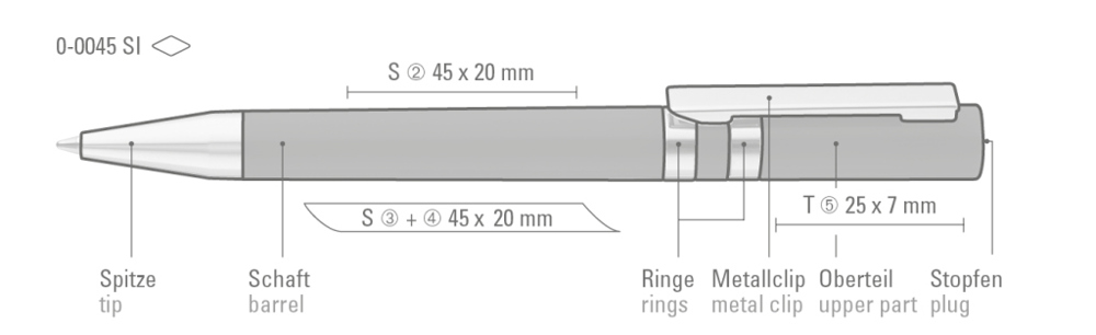 Drehkugelschreiber mit gedeckt glänzendem Gehäuse. Eingelassene Ringe, Stopfen im Oberteil, Metallclip und Spitze in silber glänzend.