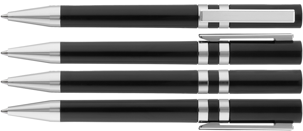 Drehkugelschreiber mit gedeckt glänzendem Gehäuse. Eingelassene Ringe, Stopfen im Oberteil, Metallclip und Spitze in silber glänzend.
