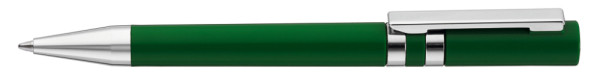 Drehkugelschreiber mit gedeckt glänzendem Gehäuse. Eingelassene Ringe, Stopfen im Oberteil, Metallclip und Spitze in silber glänzend.