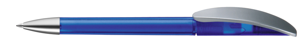 Drehkugelschreiber mit transparent gefrostetem oder gedeckt mattem Gehäuse, Bogenclip silber matt und schwerer Metallspitze matt verchromt.