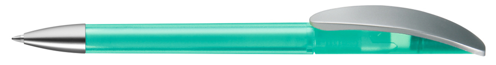 Drehkugelschreiber mit transparent gefrostetem oder gedeckt mattem Gehäuse, Bogenclip silber matt und schwerer Metallspitze matt verchromt.