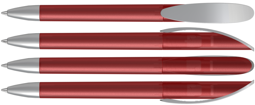 Drehkugelschreiber mit transparent gefrostetem oder gedeckt mattem Gehäuse, Bogenclip silber matt und schwerer Metallspitze matt verchromt.