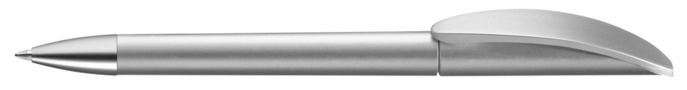 Drehkugelschreiber mit gedeckt silbernem Gehäuse, Bogenclip silber matt und schwerer Metallspitze matt verchromt.