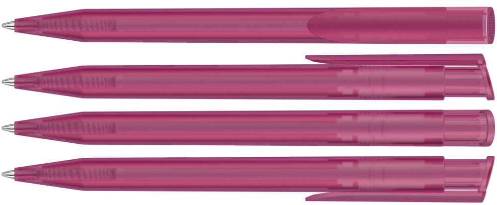 Druckkugelschreiber mit transparent gefrostetem Gehäuse und Clipdrücker.