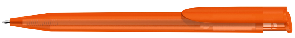 Druckkugelschreiber mit transparent gefrostetem Gehäuse und Clipdrücker.