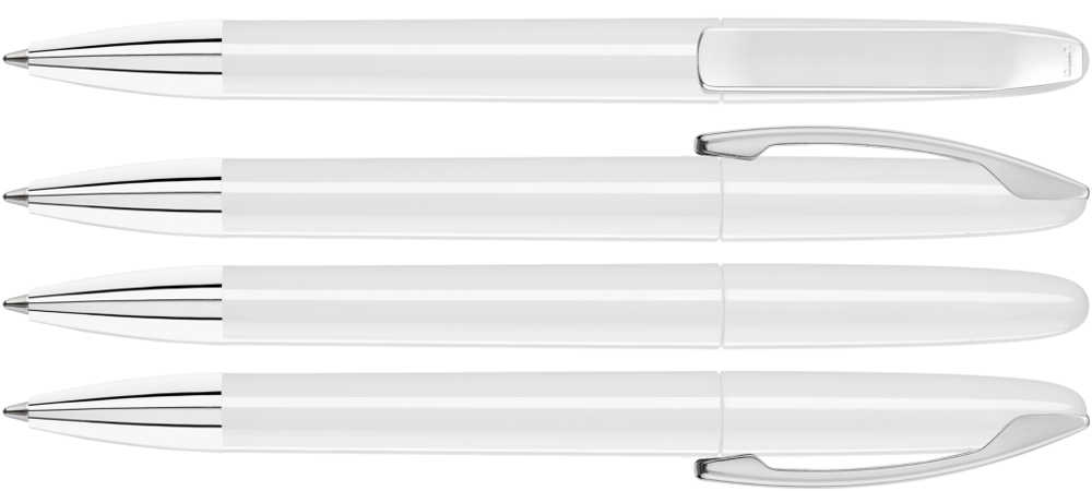 Drehkugelschreiber mit gedeckt glänzendem Gehäuse, Metallclip und Spitze glanzverchromt.