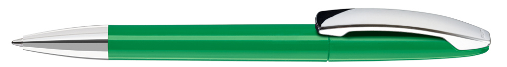 Drehkugelschreiber mit gedeckt glänzendem Gehäuse, Metallclip und Spitze glanzverchromt.