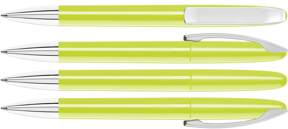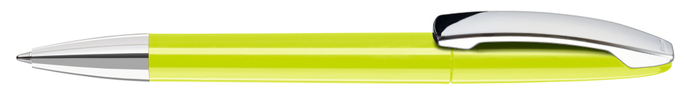 Drehkugelschreiber mit gedeckt glänzendem Gehäuse, Metallclip und Spitze glanzverchromt.