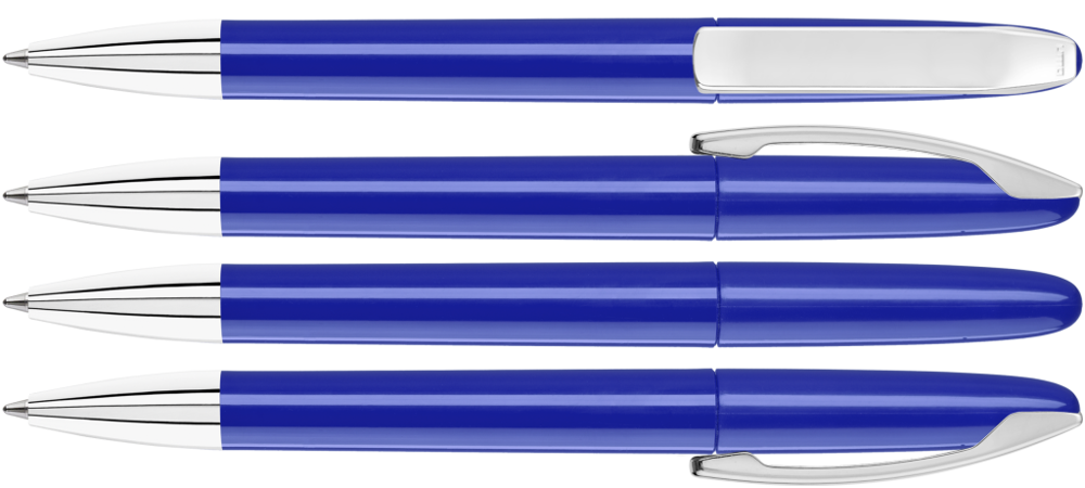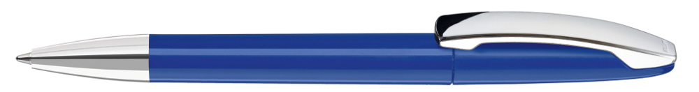 Drehkugelschreiber mit gedeckt glänzendem Gehäuse, Metallclip und Spitze glanzverchromt.