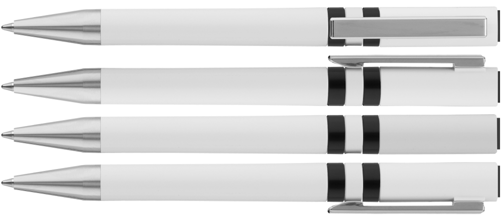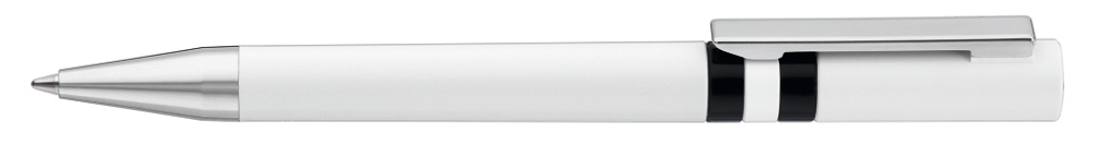 Drehkugelschreiber mit gedeckt glänzendem Gehäuse in weiß, farbig eingelassene Ringe und Stopfen im Oberteil. Metallclip und Spitze in silber glänzend.