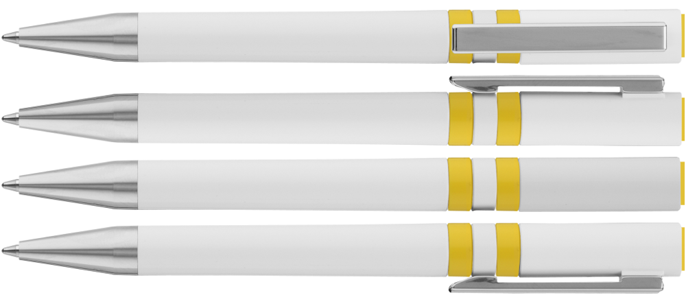 Drehkugelschreiber mit gedeckt glänzendem Gehäuse in weiß, farbig eingelassene Ringe und Stopfen im Oberteil. Metallclip und Spitze in silber glänzend.
