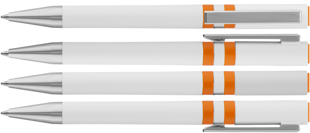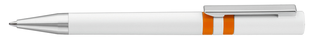 Drehkugelschreiber mit gedeckt glänzendem Gehäuse in weiß, farbig eingelassene Ringe und Stopfen im Oberteil. Metallclip und Spitze in silber glänzend.