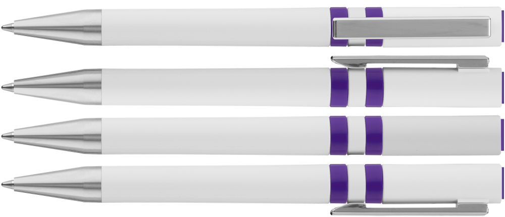 Drehkugelschreiber mit gedeckt glänzendem Gehäuse in weiß, farbig eingelassene Ringe und Stopfen im Oberteil. Metallclip und Spitze in silber glänzend.