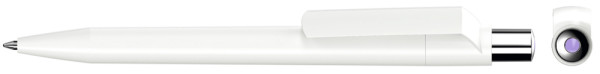 Druckkugelschreiber mit weiß gedeckt glänzendem Gehäuse, silber glänzendem Drücker und farbigem Stopfen.