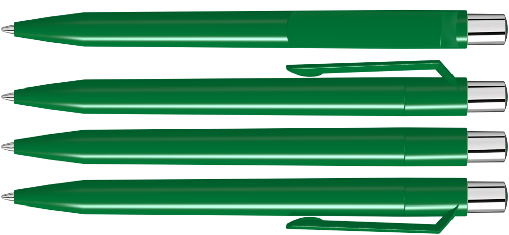 Druckkugelschreiber mit farbig gedeckt glänzendem Gehäuse, silber glänzendem Drücker und farbigem Stopfen.