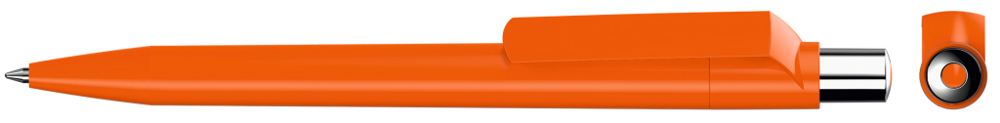 Druckkugelschreiber mit farbig gedeckt glänzendem Gehäuse, silber glänzendem Drücker und farbigem Stopfen.