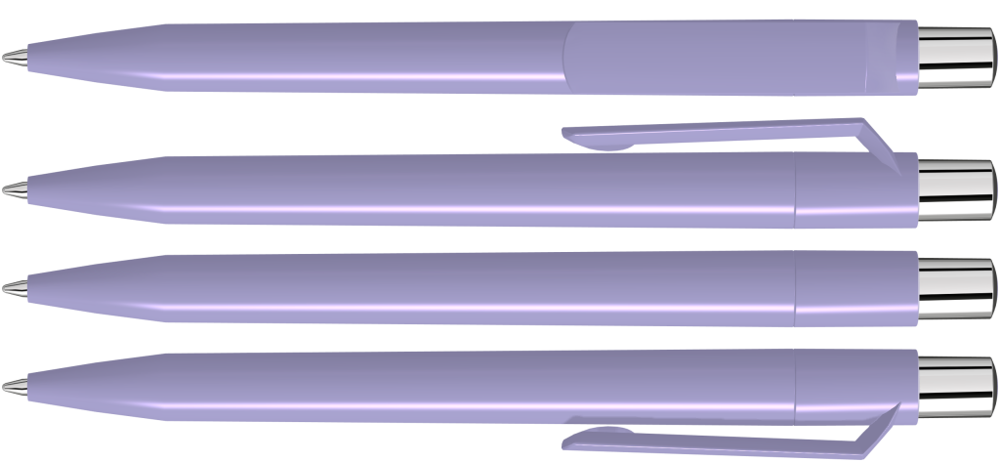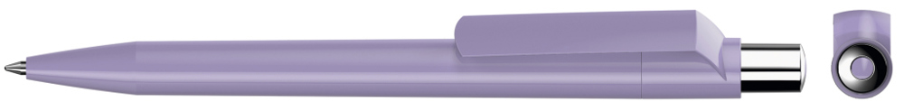 Druckkugelschreiber mit farbig gedeckt glänzendem Gehäuse, silber glänzendem Drücker und farbigem Stopfen.