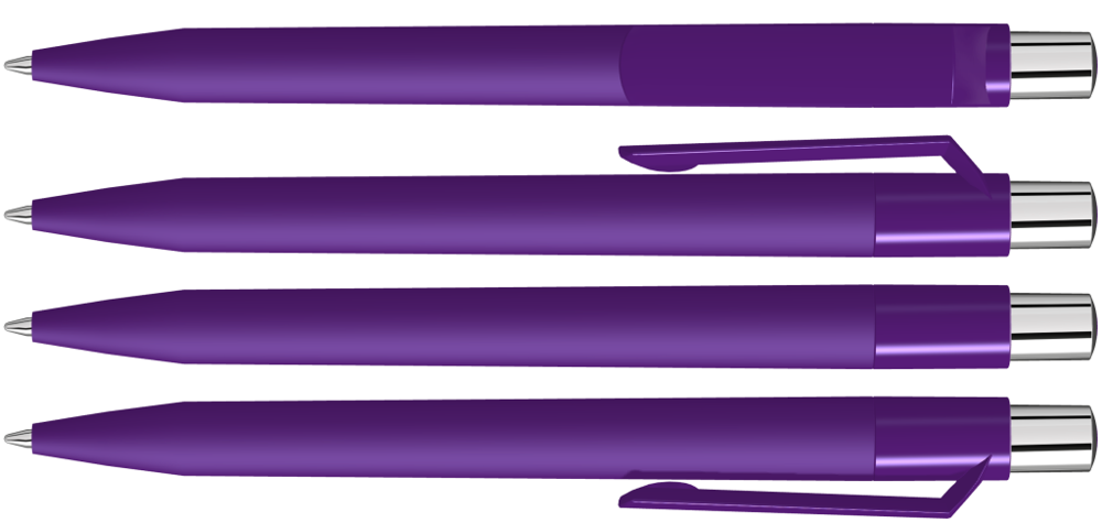 Druckkugelschreiber mit Softtouch-Schaft, gedeckt glänzendem Clip, silber glänzendem Drücker und farbigem Stopfen.