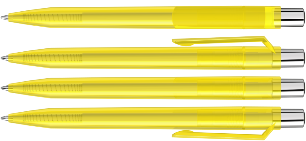 Druckkugelschreiber mit transparent glänzendem Gehäuse, silber glänzendem Drücker und farbigem Stopfen.
