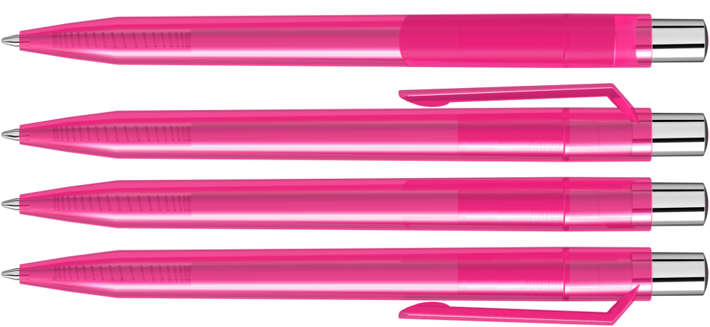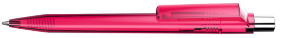 Druckkugelschreiber mit transparent glänzendem Gehäuse, silber glänzendem Drücker und farbigem Stopfen.