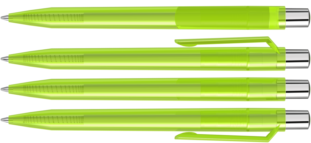 Druckkugelschreiber mit transparent glänzendem Gehäuse, silber glänzendem Drücker und farbigem Stopfen.