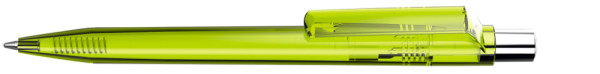 Druckkugelschreiber mit transparent glänzendem Gehäuse, silber glänzendem Drücker und farbigem... mehr
