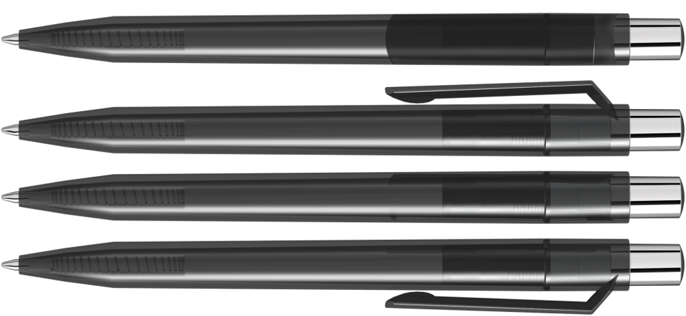 Druckkugelschreiber mit transparent glänzendem Gehäuse, silber glänzendem Drücker und farbigem Stopfen.