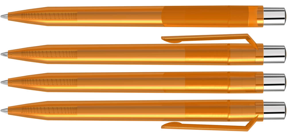 Druckkugelschreiber mit transparent glänzendem Gehäuse, silber glänzendem Drücker und farbigem Stopfen.