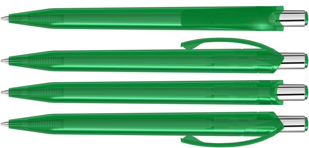 Druckkugelschreiber mit glänzend transparentem Gehäuse und Drückerstopfen. Drücker in silber glänzend.