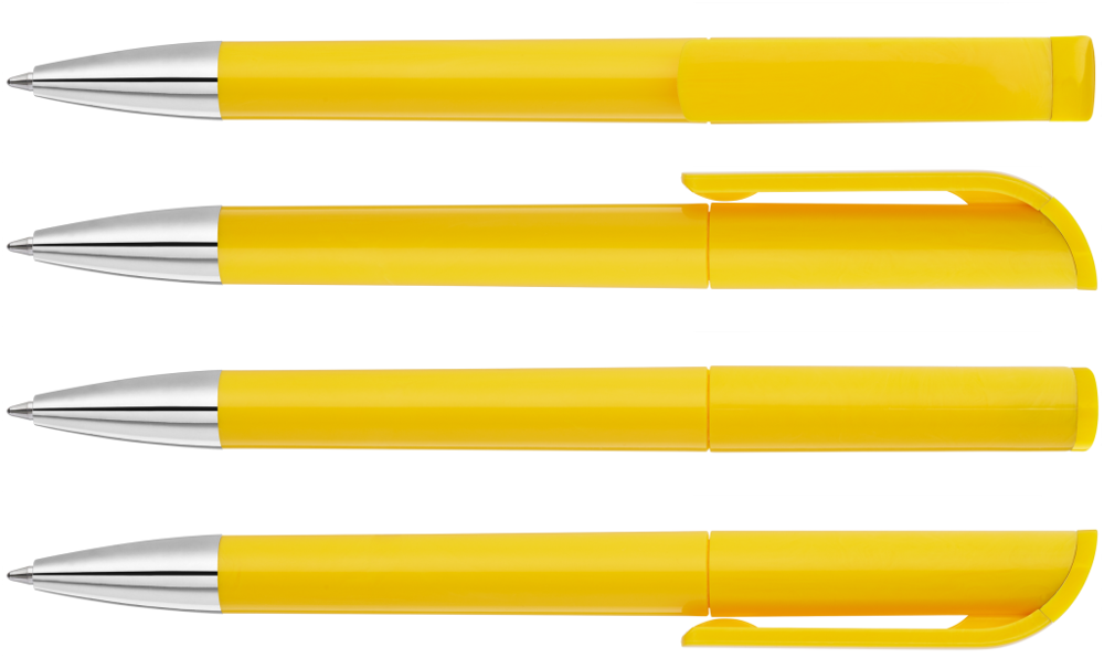 Drehkugelschreiber mit gedeckt glänzendem Gehäuse in weiß, farbig glänzendem Stopfen und Spitze glanzverchromt.