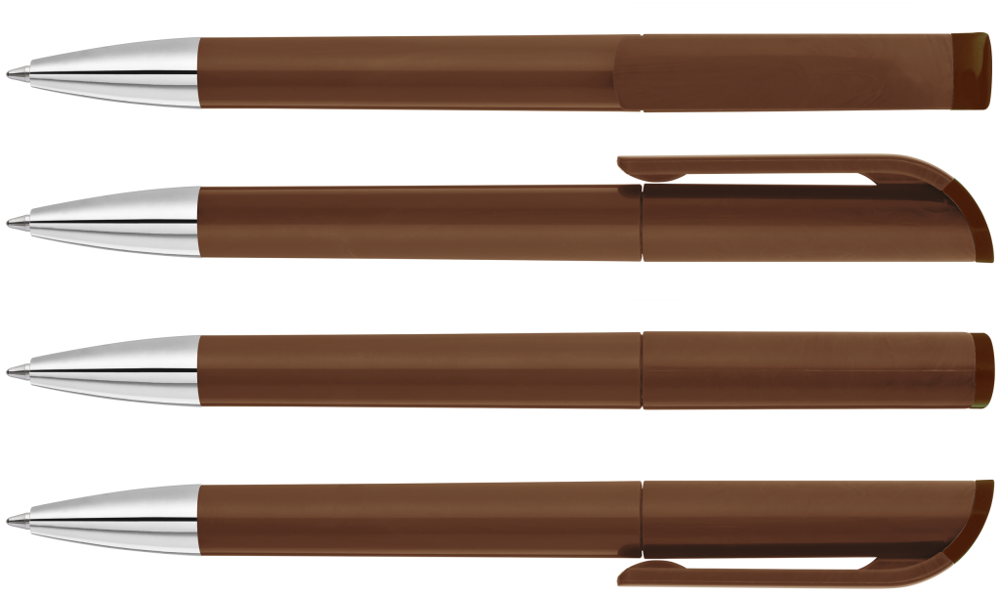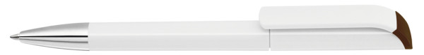 Drehkugelschreiber mit gedeckt glänzendem Gehäuse in weiß, farbig glänzendem Stopfen und Spitze glanzverchromt.
