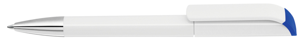 Drehkugelschreiber mit gedeckt glänzendem Gehäuse in weiß, farbig glänzendem Stopfen und Spitze glanzverchromt.