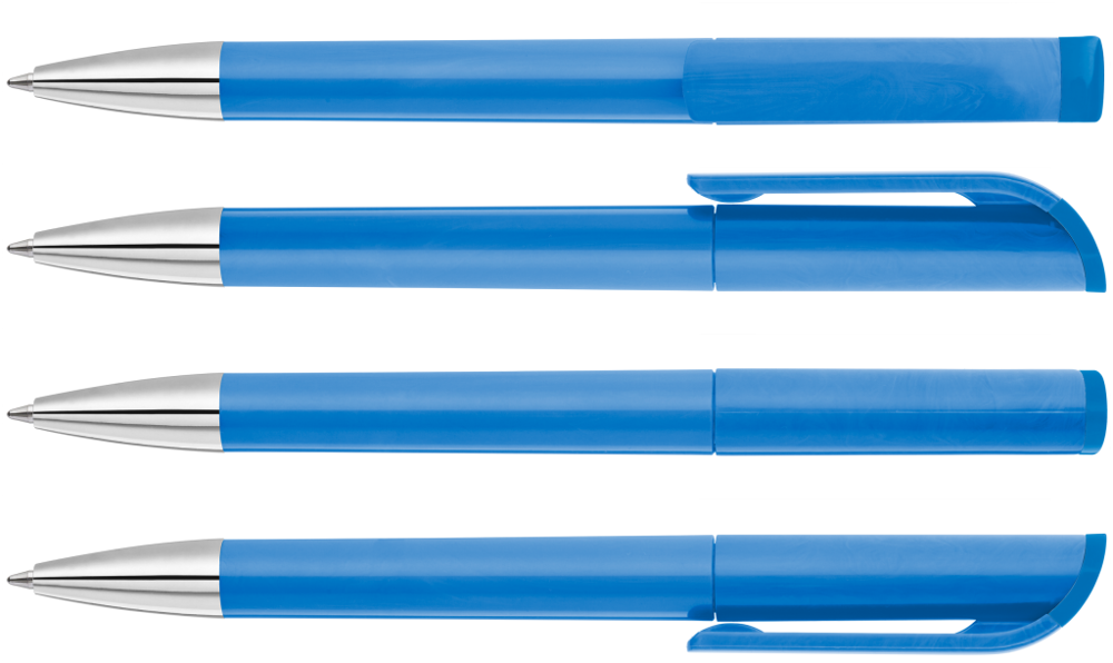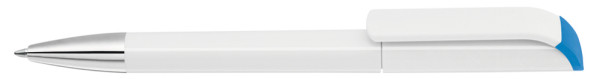 Drehkugelschreiber mit gedeckt glänzendem Gehäuse in weiß, farbig glänzendem Stopfen und Spitze glanzverchromt.