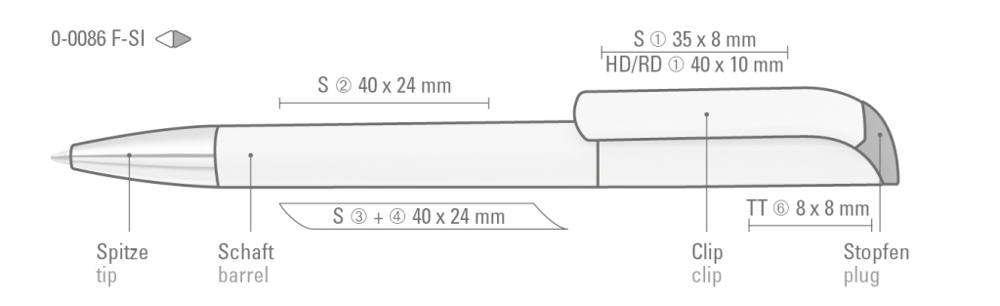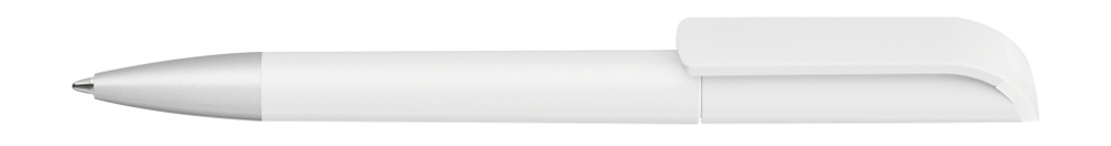 Drehkugelschreiber mit gedeckt mattem Gehäuse in weiß, farbig glänzendem Stopfen und Spitze silber matt.