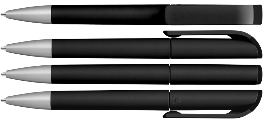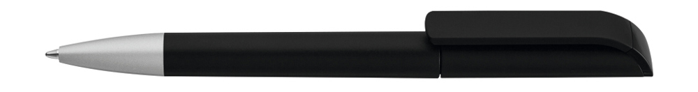 Drehkugelschreiber mit gedeckt mattem Gehäuse in weiß, farbig glänzendem Stopfen und Spitze silber matt.