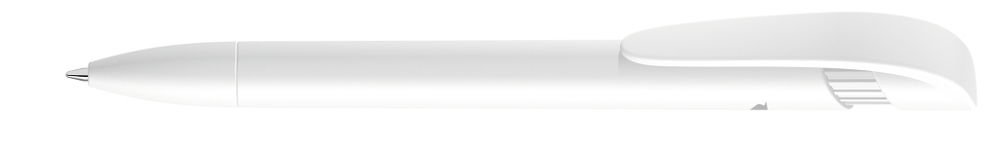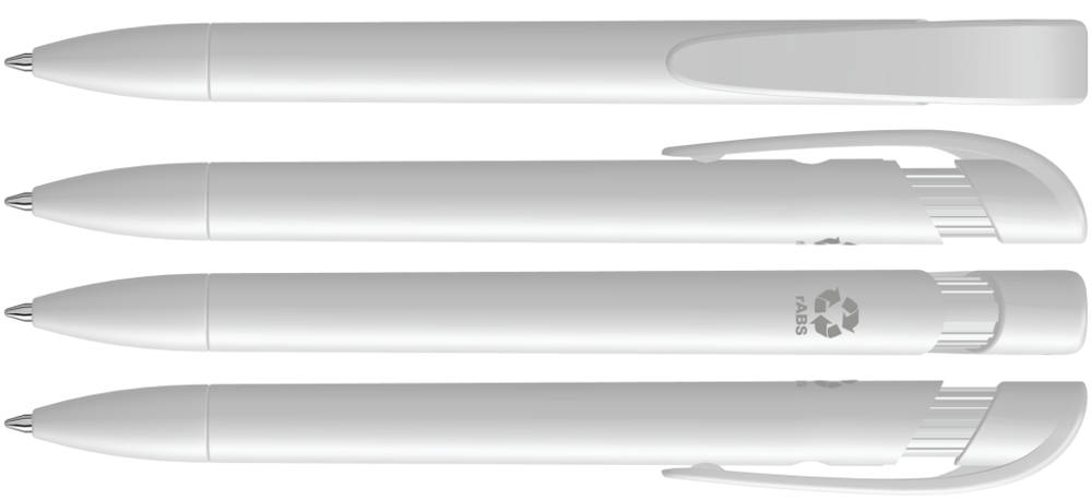 Druckkugelschreiber mit gedeckt mattem Gehäuse, breitem Bogenclipdrücker und Spitze aus recyceltem Kunststoff.