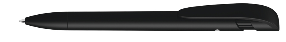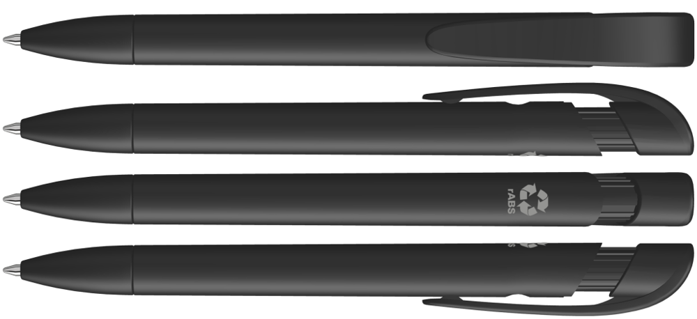 Druckkugelschreiber mit gedeckt mattem Gehäuse, breitem Bogenclipdrücker und Spitze aus recyceltem Kunststoff.