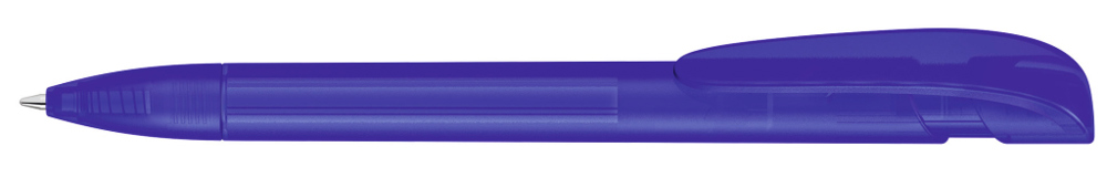 Druckkugelschreiber mit transparent gefrostetem Gehäuse, breitem Bogenclipdrücker und Spitze.