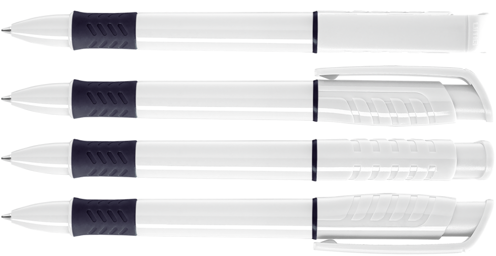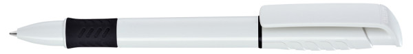 Druckkugelschreiber mit gedeckt glänzendem Gehäuse in weiß, Griffzone und Zierring farbig oder unifarben gedeckt glänzend schwarz.