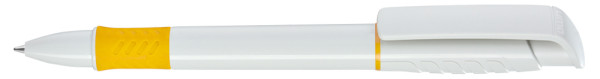 Druckkugelschreiber mit gedeckt glänzendem Gehäuse in weiß, Griffzone und Zierring farbig oder unifarben gedeckt glänzend schwarz.