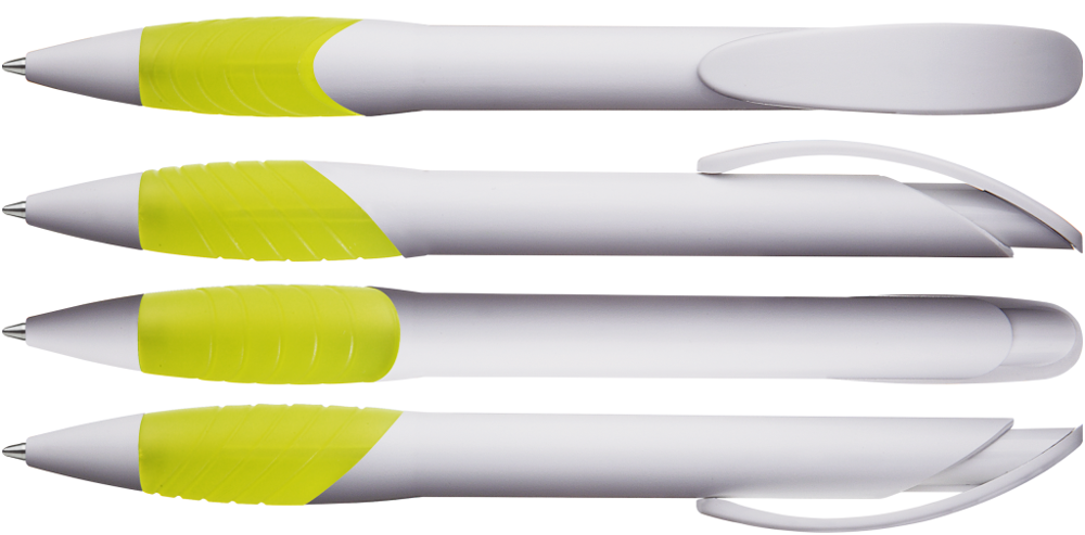 Druckkugelschreiber mit gedeckt mattem Gehäuse, Bogenclipdrücker und Spitze in weiß, ergonomische, farbige Gummigriffzone.