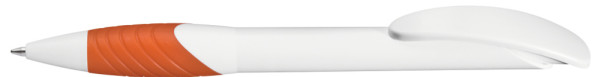 Druckkugelschreiber mit gedeckt mattem Gehäuse, Bogenclipdrücker und Spitze in weiß, ergonomische, farbige Gummigriffzone.