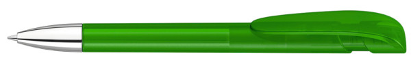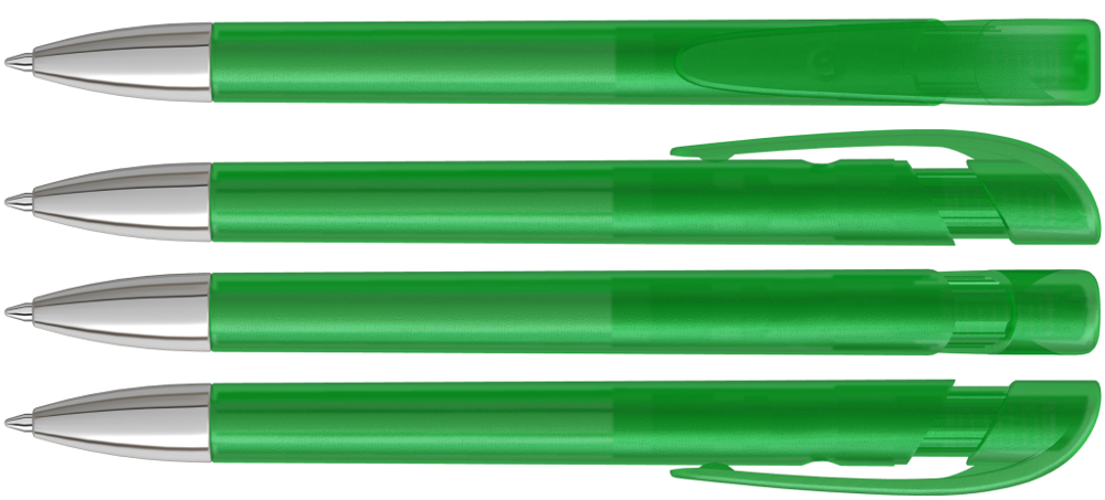 Druckkugelschreiber mit transparent gefrostetem Gehäuse, breitem Bogenclipdrücker und silberner Spitze glanzverchromt.