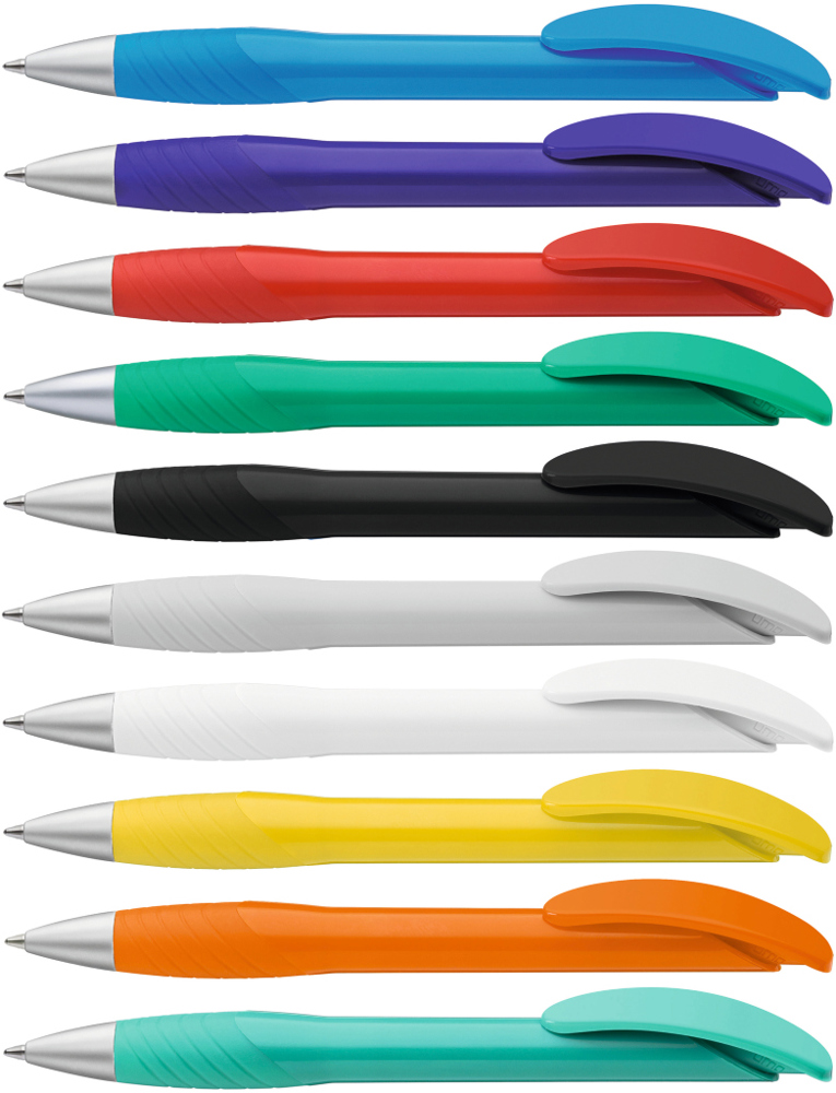 Druckkugelschreiber mit gedeckt glänzendem Gehäuse, Bogenclipdrücker, ergonomische Gummigriffzone... mehr