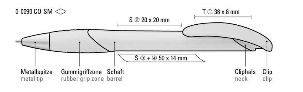 Druckkugelschreiber mit gedeckt glänzendem Gehäuse, Bogenclipdrücker, ergonomische Gummigriffzone und Metallspitze matt verchromt.