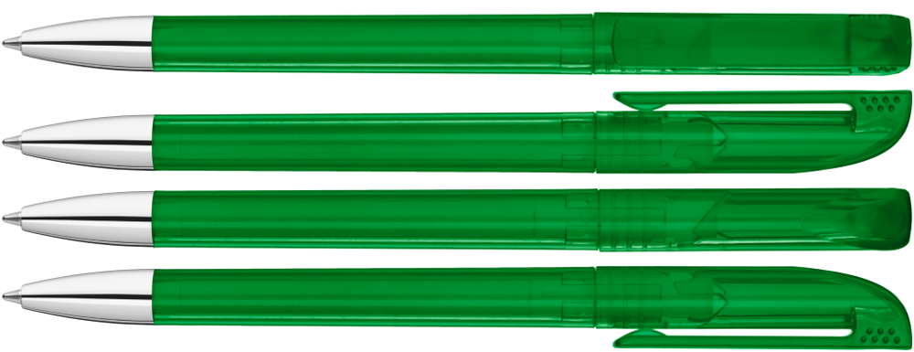 Drehkugelschreiber mit transparent glänzendem Gehäuse, gefrosteter Clipoberfläche und Spitze glanzverchromt.