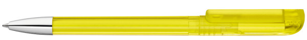Drehkugelschreiber mit transparent glänzendem Gehäuse, gefrosteter Clipoberfläche und Spitze glanzverchromt.