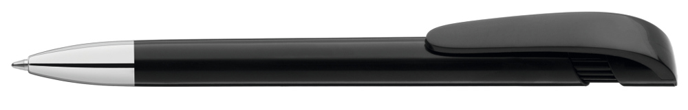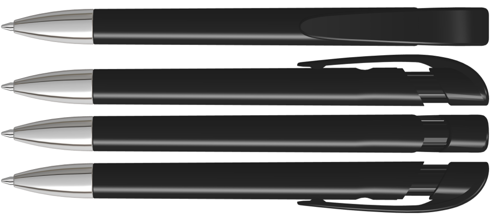 Druckkugelschreiber mit gedeckt glänzendem Gehäuse in schwarz oder weiß, breitem Bogenclipdrücker und schwerer Metallspitze glanzverchromt.