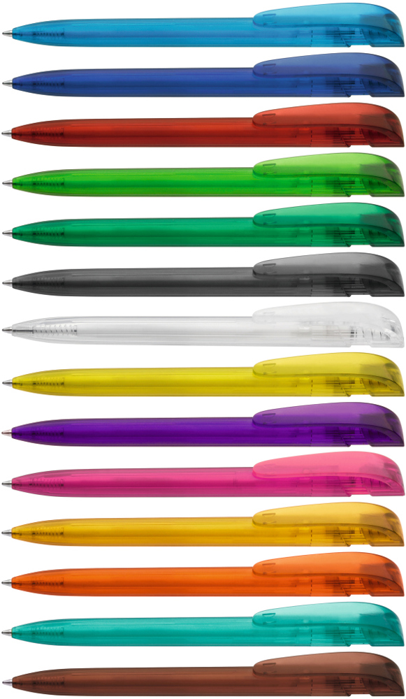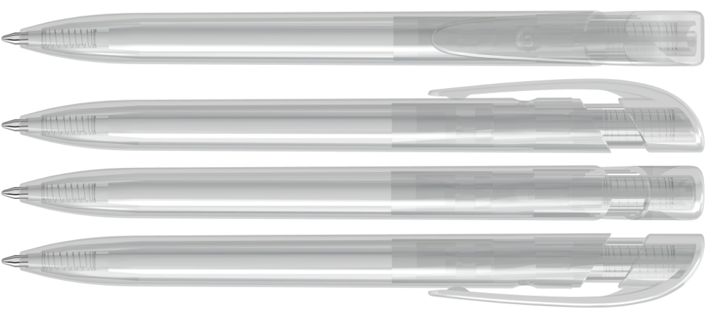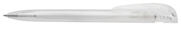 Druckkugelschreiber mit transparent glänzendem Gehäuse und breitem Bogenclipdrücker.