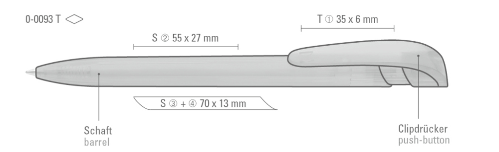 Druckkugelschreiber mit transparent glänzendem Gehäuse und breitem Bogenclipdrücker. mehr